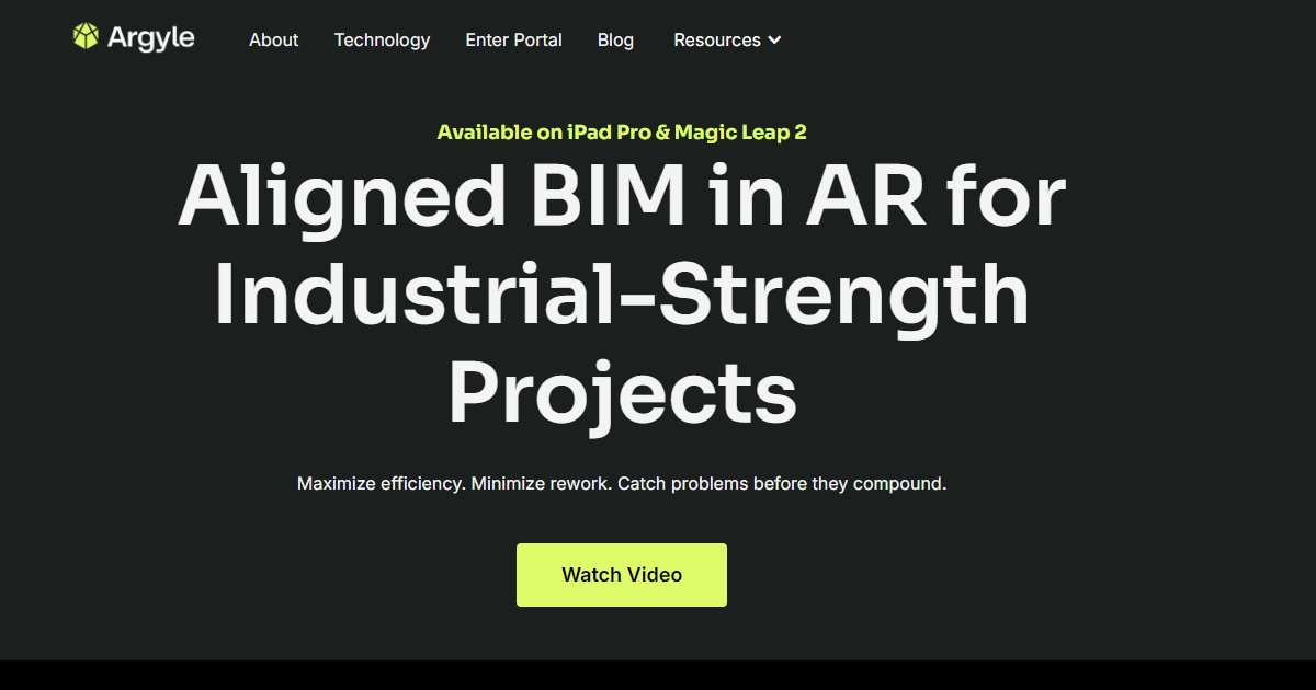 Argyle is an augmented-reality field platform from Argyle Build Inc. that aligns federated BIM geometry with real-world jobsites on HoloLens 2, Magic Leap 2, and Apple devices, with Revit and Navisworks upload paths and workflows for QA observations.